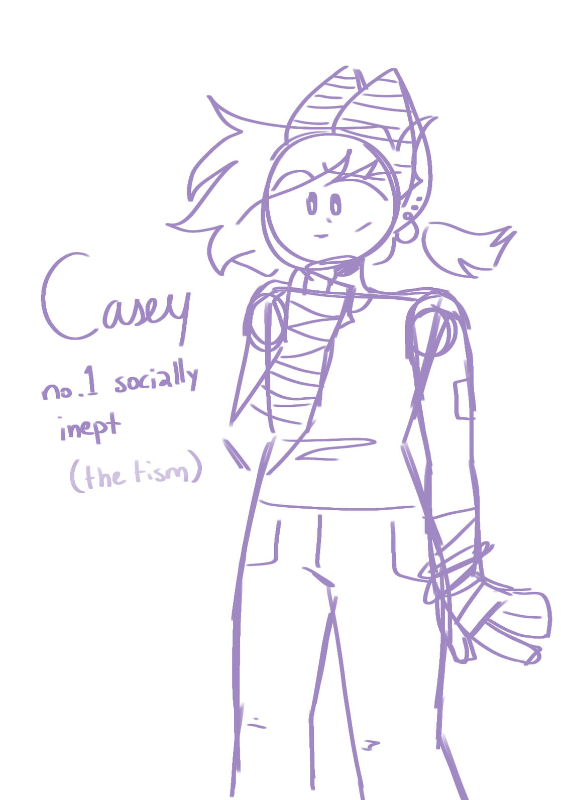 Casey is 5'7" (170.18 cm). His skin is a light, dull purple. He has fluffy, dark, purple hair. For the majority of the first couple arcs, Casey wears a black tank top and ripped blue jeans. He has bat ears and is often wearing his hair in a ponytail.Other: Casey has a knack for thinking through and tackling high-stress situations, at least in the moment. He finds himself acting as the voice of reason in many situations, and he likes to keep an open mind about things.First Appearance: Casey wakes up in his bed (as one does) in the first sentence.