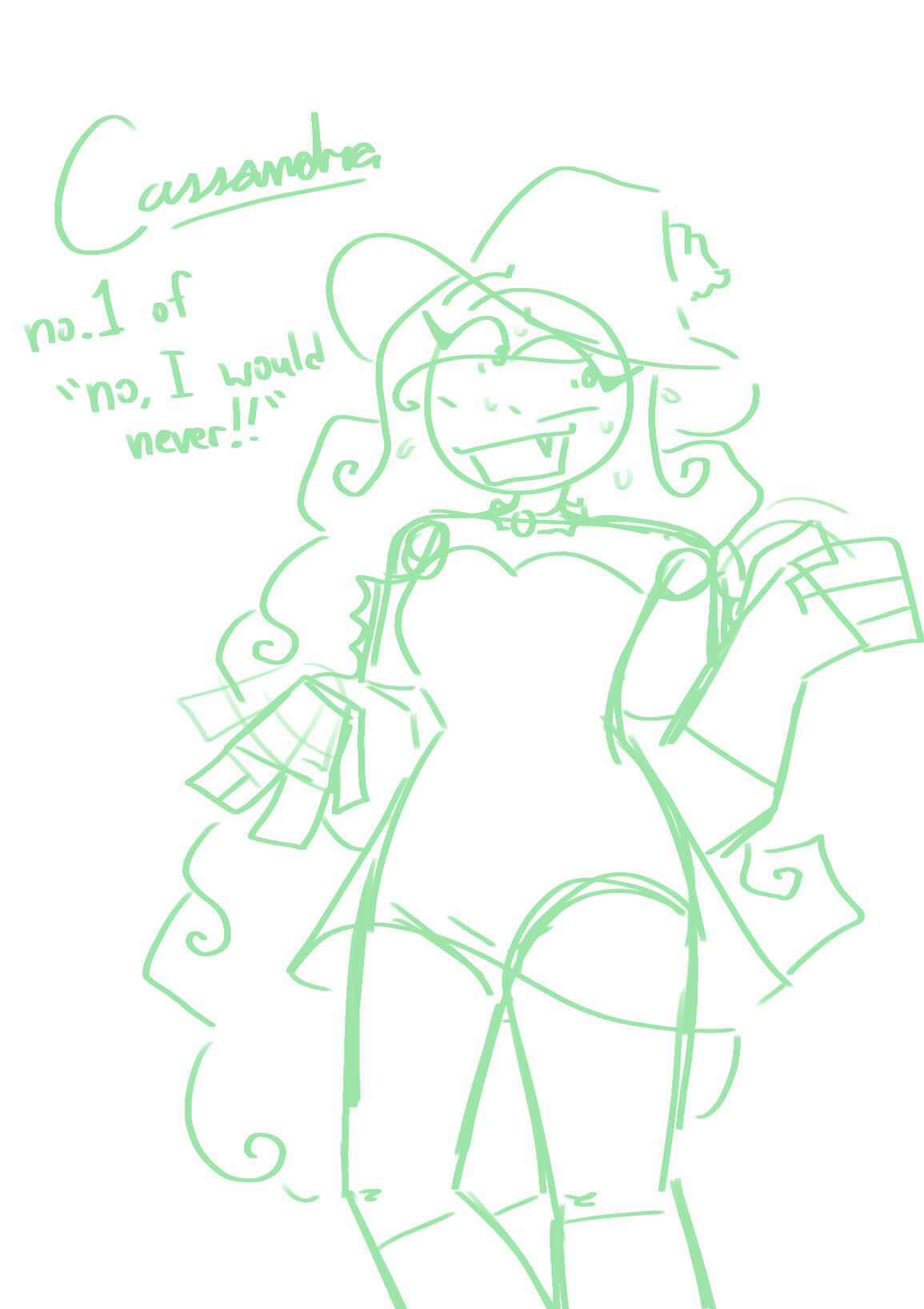 Cassandra is 6'2" (187.96 cm). Her skin is lightly tanned and she has a few freckles and scars. Her hair is thick, long, ridiculously swirly, and is a deep coffee color. Her eyes are a dull green, and they become brighter the more magic that she uses. Cassandra always wears an off-shoulder, thigh-length lavender dress, with mesh sleeves. She wears her trademark hat, which is the same color and falls over at the ends. She wears a thick lace choker with a red gem in the center. She wears lavender pump heels.Other: Cassandra has BPD and PTSD. She spent many years trying to resurrect her younger sister.First Appearance: We find Cassandra in her cabin, being witchy and devious.