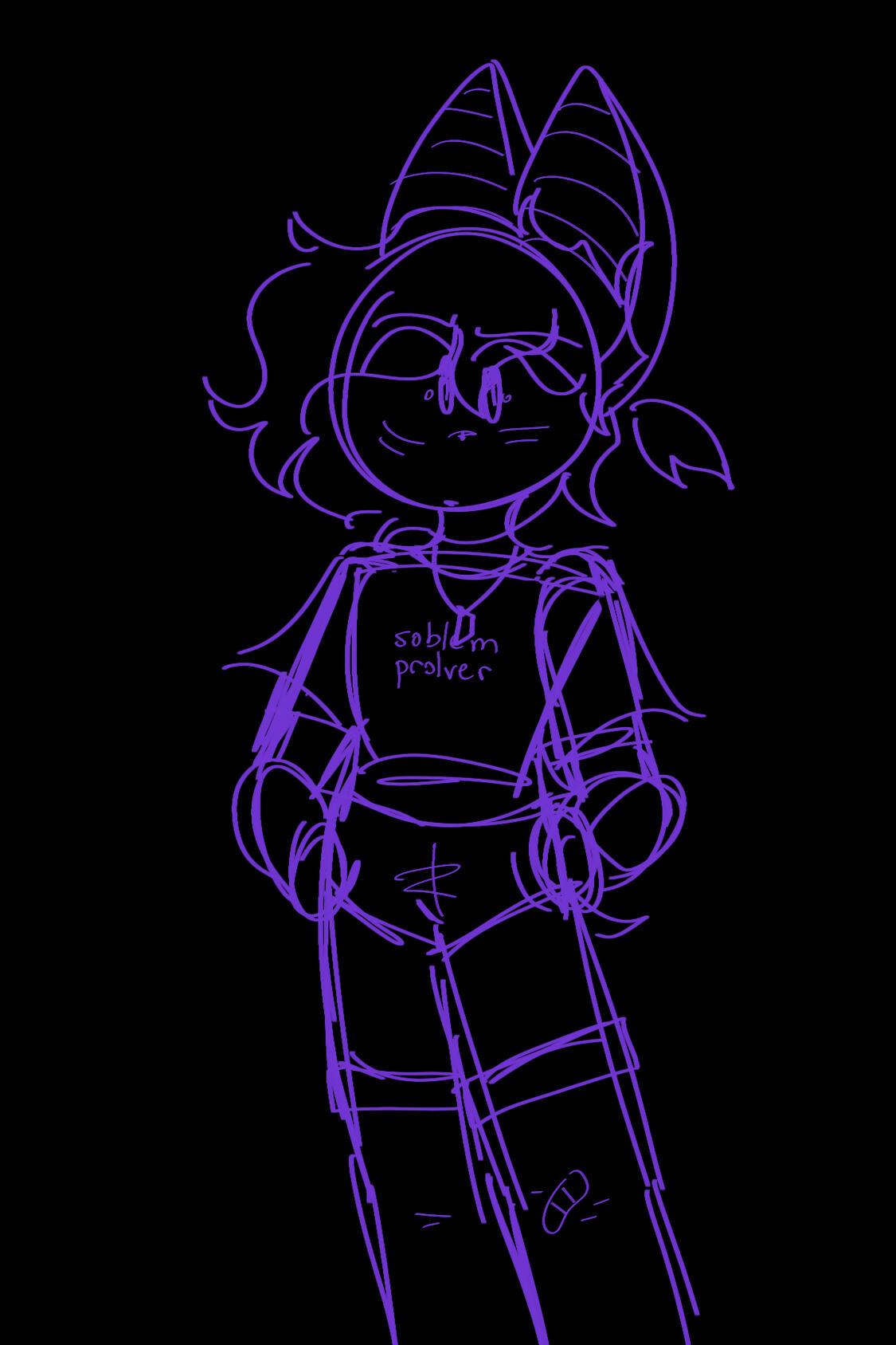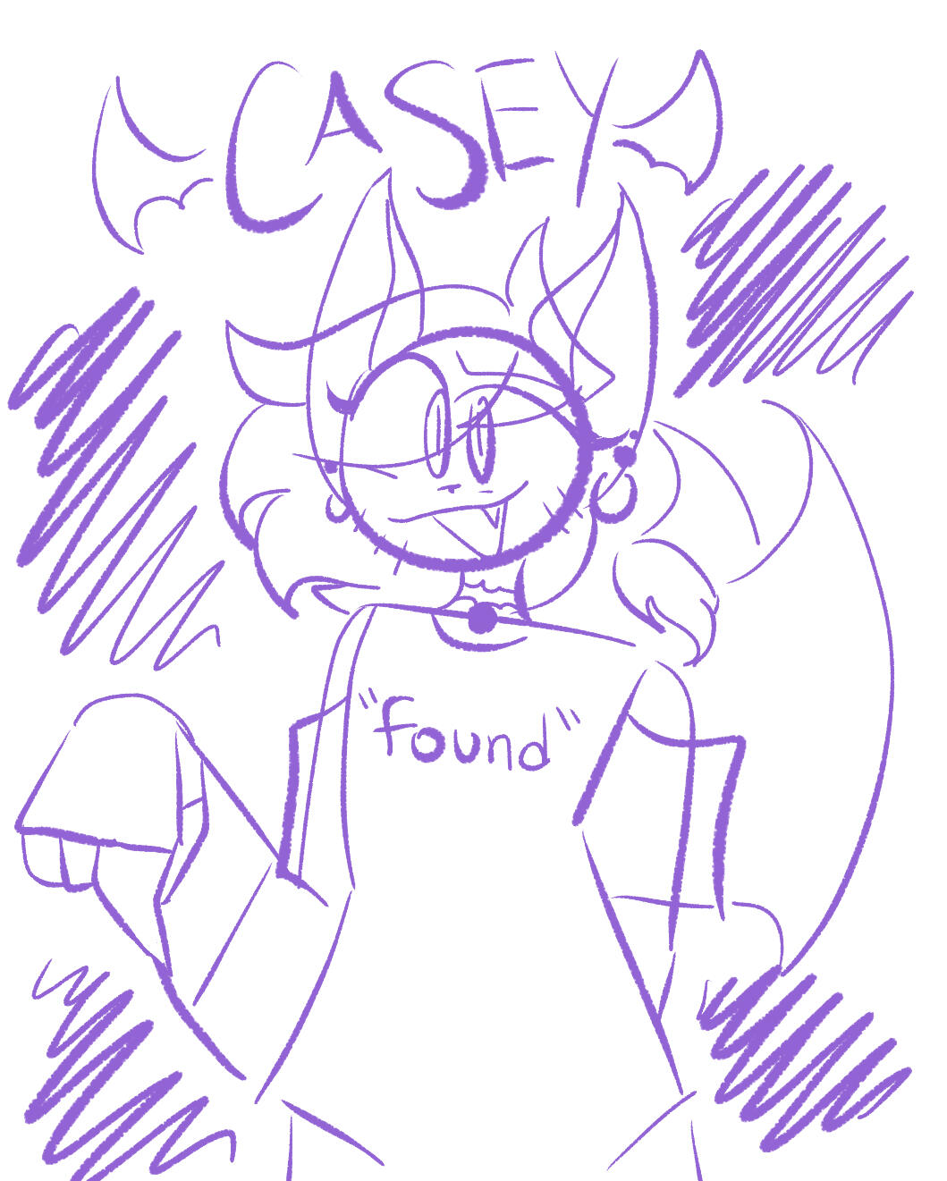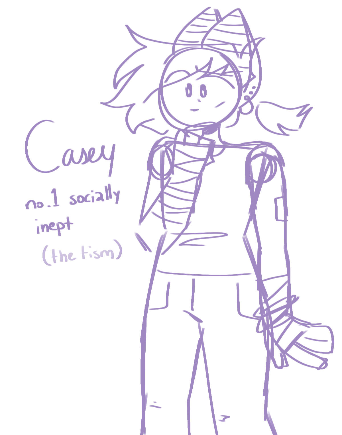 Casey is 5'7" (170.18 cm). His skin is a light, dull purple. He has fluffy, dark, purple hair. He has bat ears and is often wearing his hair in a ponytail.Other: Casey experiences chronic pain. He's had it since he was a kid.First Appearance: Casey wakes up in his bed (as one does) in the first sentence.