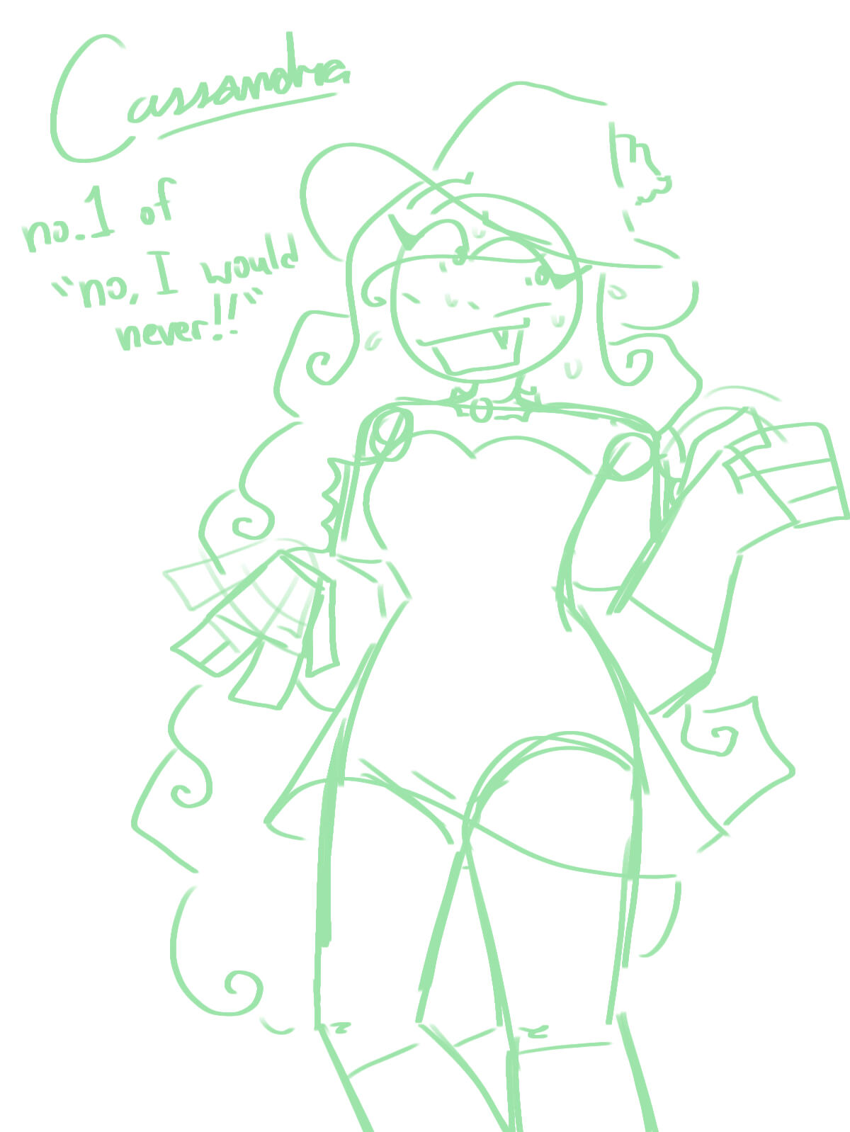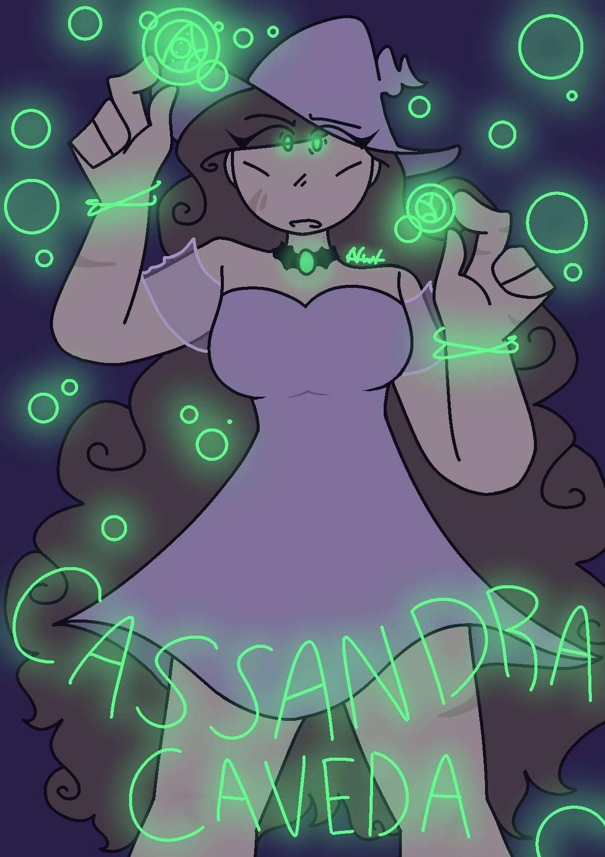 Cassandra is 6'2" (187.96 cm). Her skintone is around mid-range, littered with scars and scratches and patches of soot. Her eyes are like those of an animal seeking its prey--a sickly emerald green that stares its way into the observer's soul. It is as if her very gaze is a spell.Other: Cassandra's new motif is associated with Spiders.First Appearance: After sending a letter to Casey and Bryz, the two break their way into her cabin in the middle of the woods.