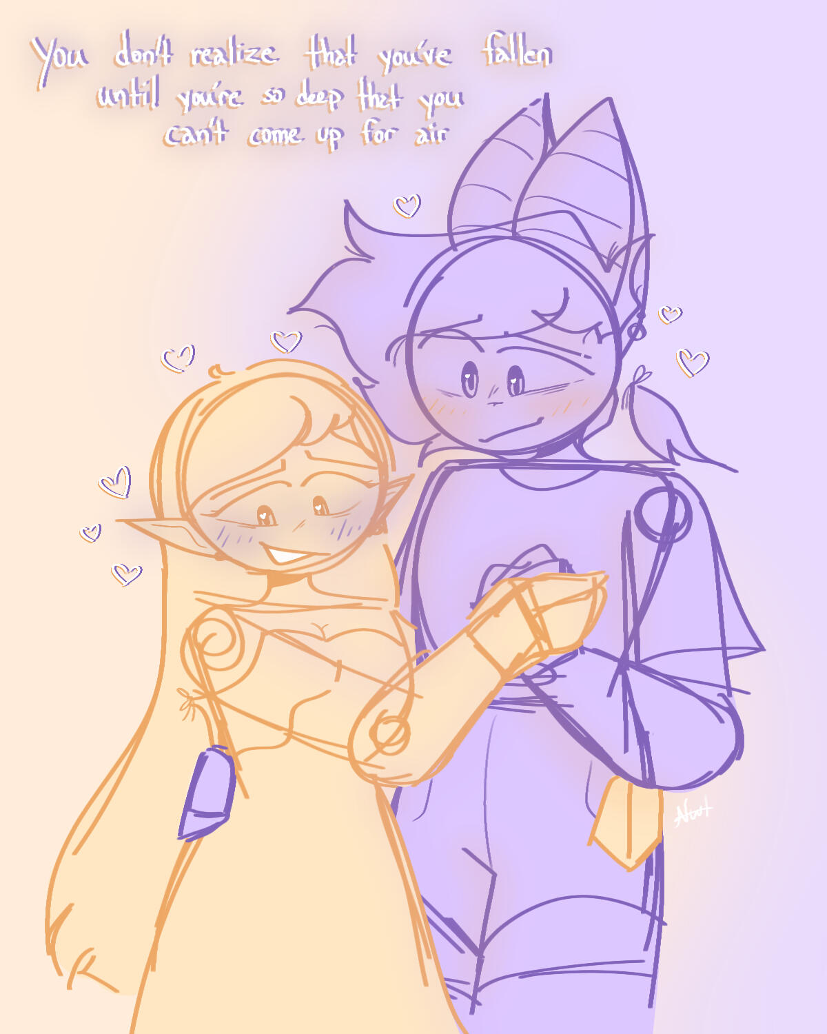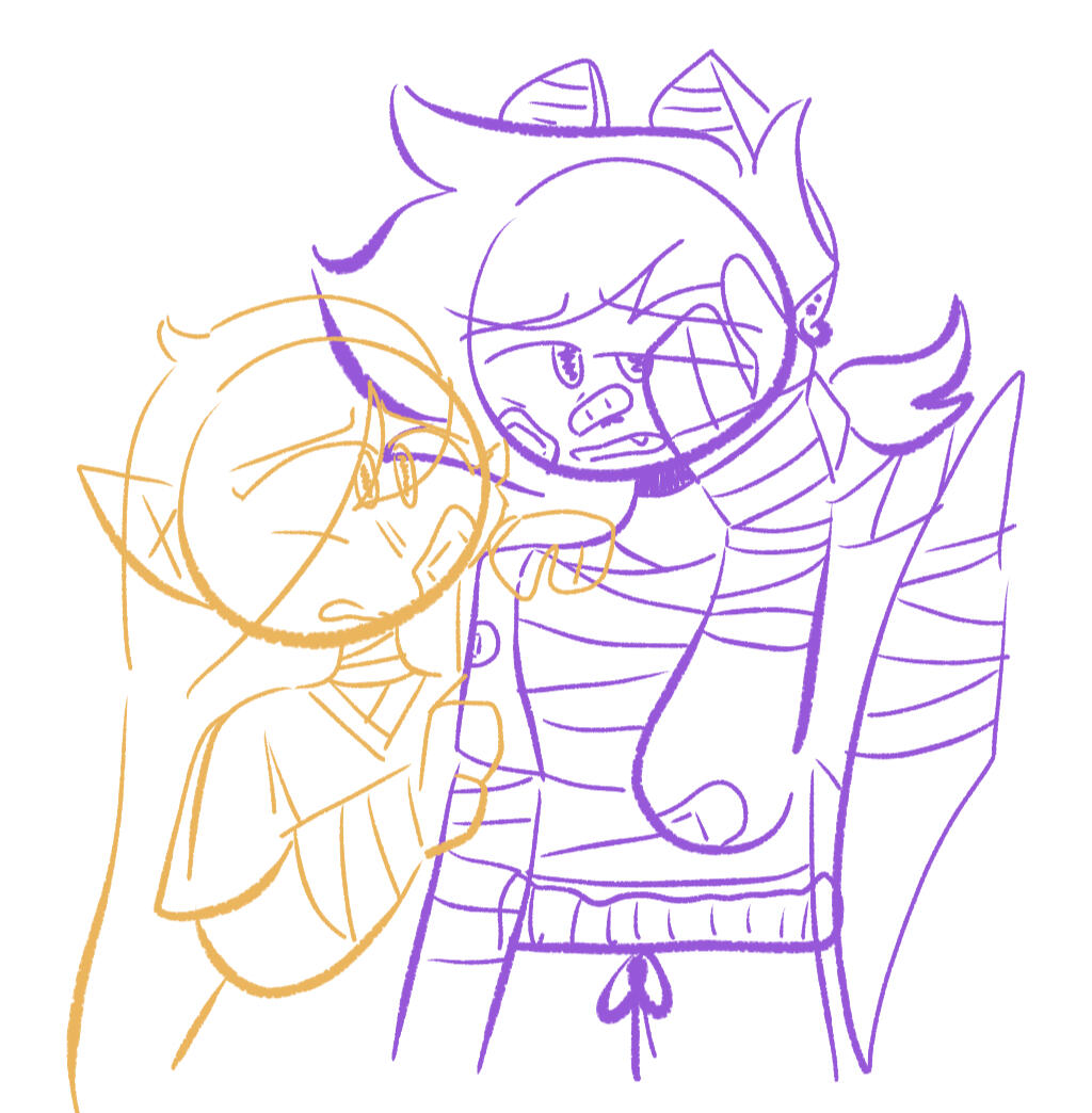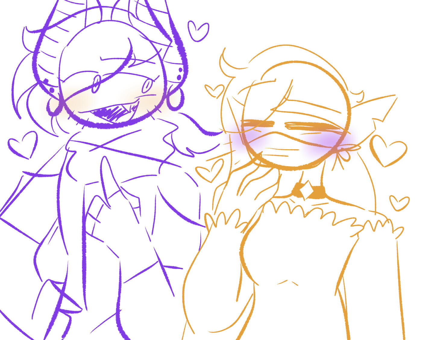 This is the first sketch I ever made of Casey and Bryz together! It was around Halloween, and I wanted to make a couple that had some Halloween inspiration (hence why their colors are purple and orange and Casey is a bat). This was when I updated Bryz's pendant to be a choker, but she keeps the mask for a bit. At this point, the plot was largely just a romance, and it would follow C+B falling in love... I eventually changed the plot to be more of a fantasy with their romance already established. The story of how they met and grew to love each other is still very much on the table for me to write, though!